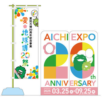 愛・地球博20祭ロゴの顔はめパネルとのぼりを設置します。