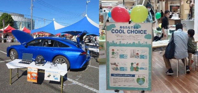 地球温暖化対策課ブースでは、地球温暖化対策のために日常生活でできる「COOL CHOICE(クールチョイス:賢い選択)」の宣言と缶バッジづくりコーナー、ゼロエミッション自動車「MIRAI」の展示と給電体験コーナー、また再生可能エネルギーを活用して製造する低炭素水素に関する取組の展示を行います。