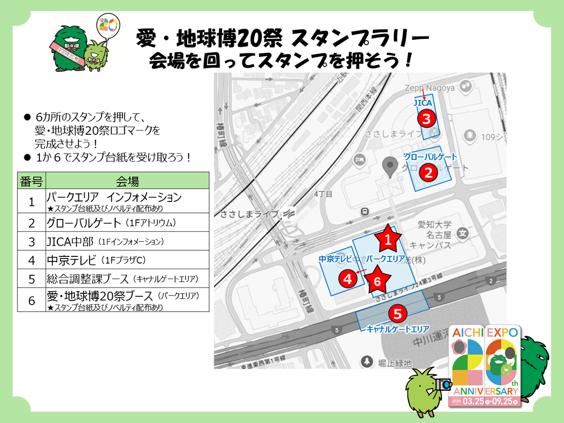※愛・地球博20祭PRブースは、キャナルパークささしま パークエリア内に出展します。