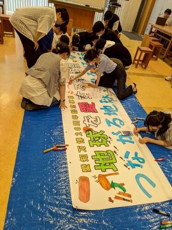 会場サインとして、各タームのスローガンを掲げた横断幕を制作しました。制作にあたっては、5月31日のオンライン会議において、タームごとで話し合い、スローガンを決定しました。6月8日には、学生達がモリコロパークに集まり、タームごとで決定したスローガンを掲げた大きな横断幕を作り上げました。制作された横断幕はイベント当日、会場内に飾られますので、是非、ご覧ください。