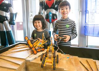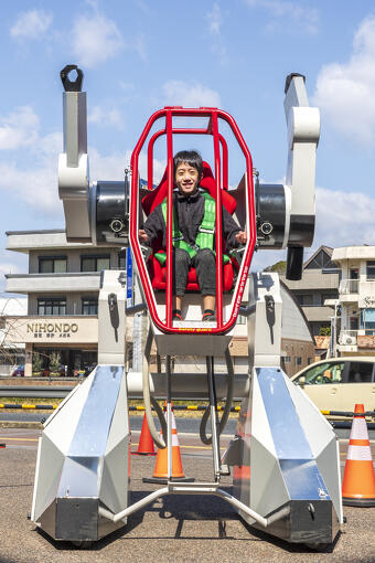 搭乗できる大型ロボット。からくり機構を持ち、子どもから大人まで安全に操縦できます。君も、ロボットパイロットになろう!