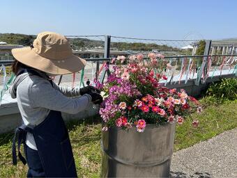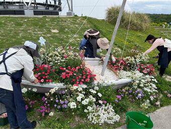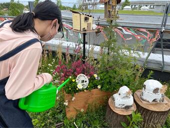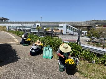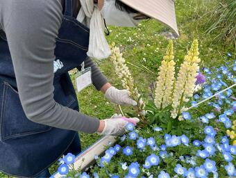 おそろいの風の丘オリジナルエプロンを着用して、風の丘の花壇の水やりや花がら摘み、雑草取りなどを通じて、植物の成長を見守りながら、風の丘を訪れる来園者の皆さんに楽しんでもらえる空間作りをお手伝いしてくれています。